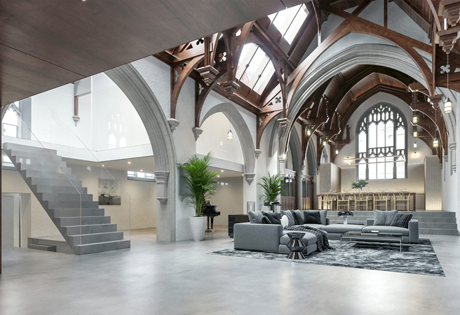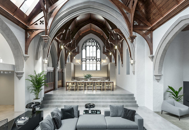 It will include a contemporary micro-cement upper floor which folds up to form a new podium, containing the original chancel and altar.