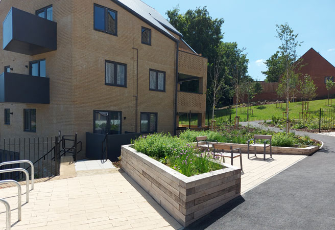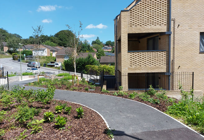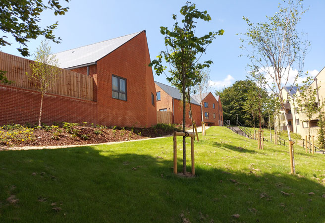 UBU have worked with Snug Architects and Winchester City Council’s New Homes Delivery Team to produce a comprehensive landscape masterplan to deliver 76 new affordable homes. The scheme provides a mixture of 2 and 3 bedroom houses and 1, 2 and 3 bedroom flats on a very steep challenging site in The Valley. We designed a contemporary and robust landscape that knits the new development into the existing open parkland