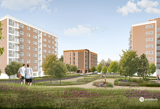 Designed by T2 Architects, this scheme consists of 73 flats and 3 houses in an enhanced landscape setting, with the new flats a mix of 1 and 2 bedroom and shared ownership and rented. Parking has also been provided for the new flats in a range of small and large parking courts.