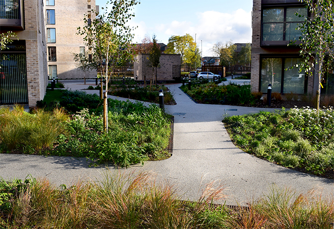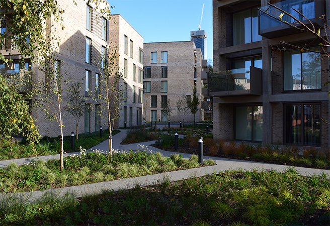 Royce Road and Leaf Street are social housing developments collectively known as Hulme Living, and Ubu are delighted to have been working on both schemes with acclaimed architects. Royce Road, designed by OMI, consists of 67 two-bedroom apartments and is now fully occupied. The strong overall landscape design approach and attractive planting scheme has really helped to bed the new blocks into the surrounding streetscape and deliver a great landscape for residents.