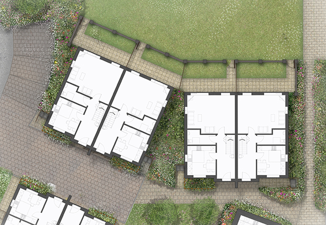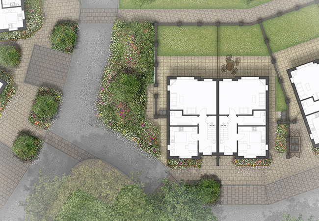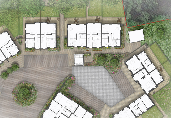 The landscape strategy has been developed to create a coherent design approach to the public spaces and circulation. This delivers a strong framework within which the architecture is set, maximising open space and providing an attractive development centred around the Listed house.