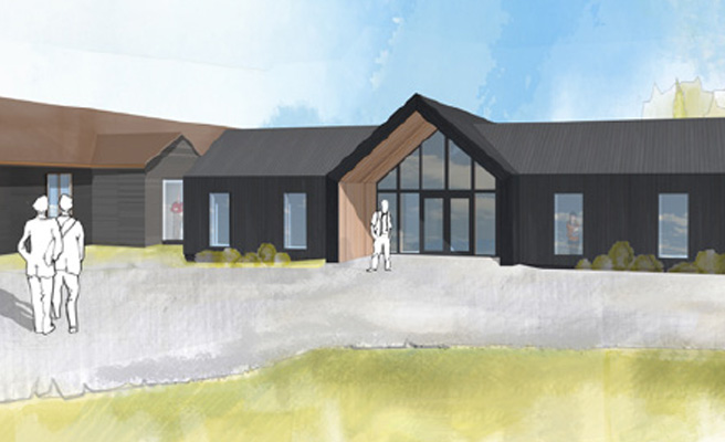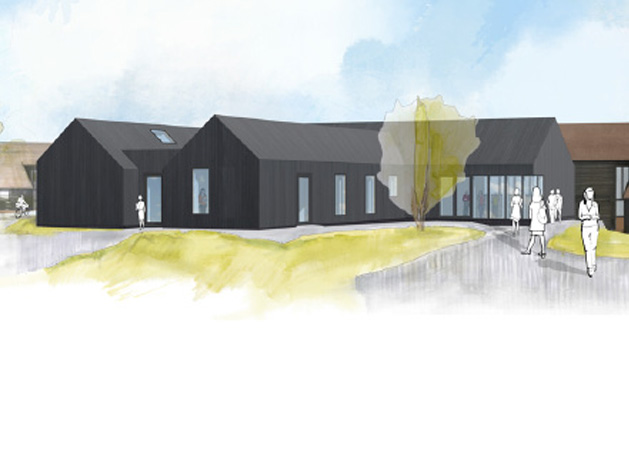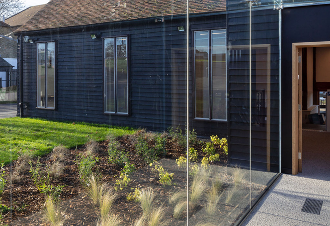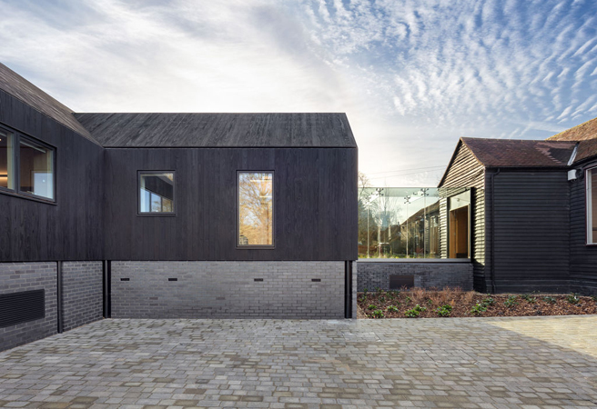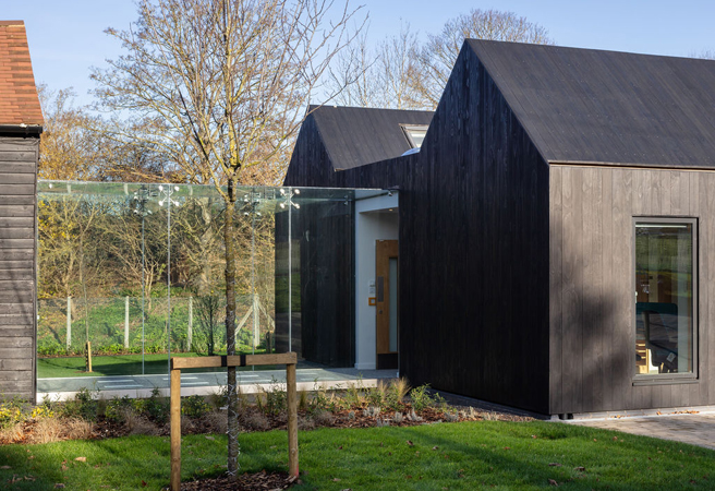 The form and materials of the new build element have been chosen to complement and reflect the adjacent listed barn in a contemporary manner. Charred timber clads both the walls and roof, creating a homogenous form reinforced by the simplicity of the detailing. The landscape reflects the form picking up on the building articulation to express key points of access as well as integrating the new building into the broader site context.