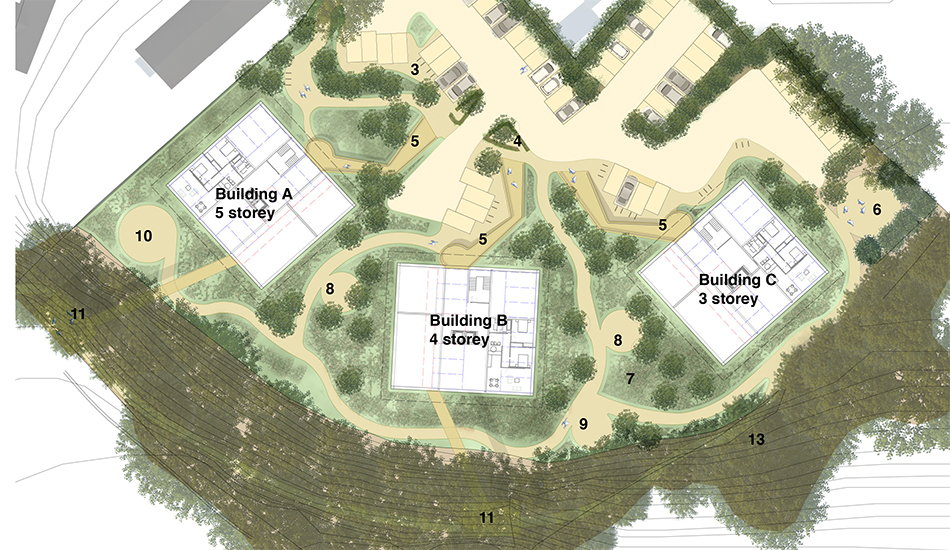 The site accommodated three pavilions which allowed for sufficient open space to enable views to the wooded escarpment, open recreational space and appropriate surface car parking provision for residents and guests.