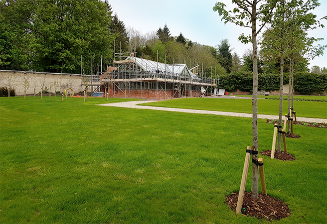 We are nearing completion on the development of Syrencot house, a Grade II listed building on the banks of the Avon. The house will be transformed from a private country house in to a modern country wedding venue with new ceremony and reception buildings within the grounds. At the heart of the new venue is the redevelopment of the enchanting walled garden with the existing chalk walls being retained and the formal path network embellished with a rich diversity of planting. Additionally a vegetable patch and orchard have been incorporated to hark back to the former use of this space. The design delivers an integrated network of paths to deliver the bride and guests from the main house to the new glass ceremony building then onto the new large airy reception building. The restored Pump House in the walled garden has been repurposed as an outdoor kitchen with a barbecue and wood-fired pizza oven, delivering alfresco dining.